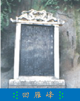 回雁峰居南岳七十二峰之首,景区面积21312m2,是衡阳市重点文物保护单位。回雁峰之名来源有二:一曰北雁南飞越冬,至此气暖,不再南飞而北归;一曰山形似雁,张翼回翔。 回雁峰海拔96.8米,山虽不高,因历史名人的诗文以它为典故者甚多,文因景成,景借文传,故名扬天下。唐代诗人王勃在《滕王阁序》中有“雁阵惊寒,声断衡阳之浦”佳句。伟大诗人杜甫曾居衡阳,留下了“万里衡阳雁,今年又北归…………”的诗句。杜鹤、高适、文天祥、范仲俺等都留有脍灸人口的诗文。又因明未清初的大思想家王夫之出生于此,南宋大理学家周敦颐从小在衡州舅父家成长,人文荟萃。使回雁峰名胜古迹更是名溢中外。 回雁峰上最著名是雁峰寺,梁天监十二年(会元513年),宏宣法师选回雁峰创建寺院,武帝萧衍赐名“乘云禅”。唐代改号为“山门寺”。明清之际建“寿佛殿”。抗日战争,衡阳蒙难,千年古刹,在劫难逃。